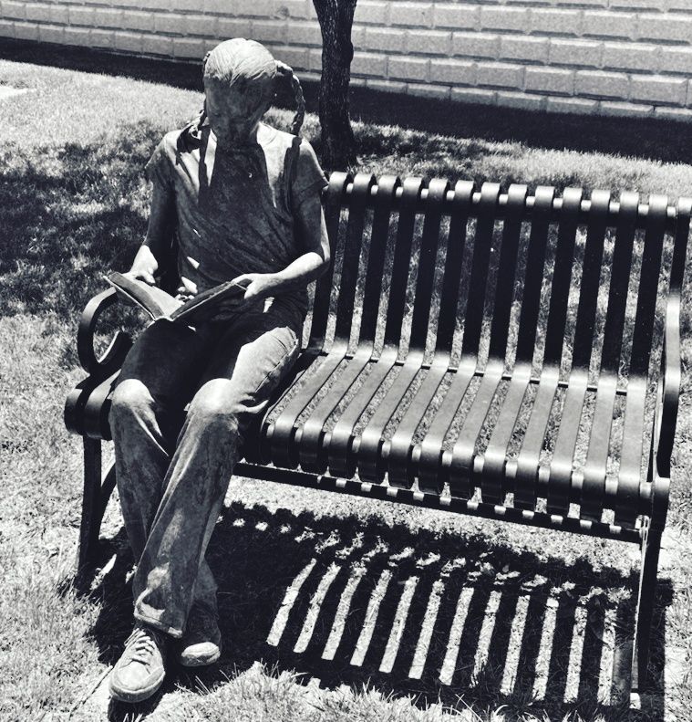 Eli sees her, considers walking by on the other side, but crosses over and sits. A bronze statue of a student reading a book occupies the end of the bench beside Margaret; she looks up.